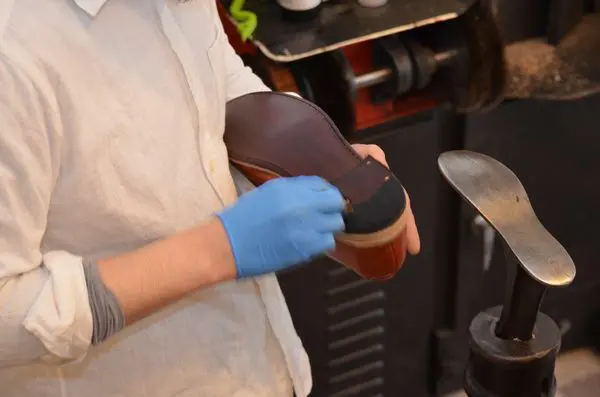 7 新しいアウトソールと靴底両方に接着剤を塗布します。新しい革は、接着剤を一度塗っただけでは吸い込んでしまうため、接着剤は二度塗りします。さらに、最大限の強度が発揮できるよう、少し乾燥させます。