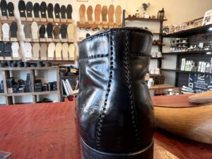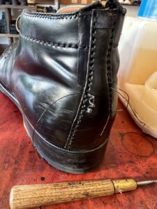 ヒール中心の革をほどき開いた後にまず裂けを縫合します。