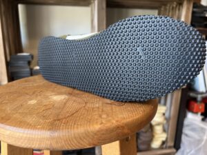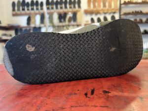 ヒール部分が削れていたので白スポンジで足したのち今回は、つま先の捲り部分や幅が広いソールにも対応出来るシート状のスポンジラバー配合ソールを使用いたしました。